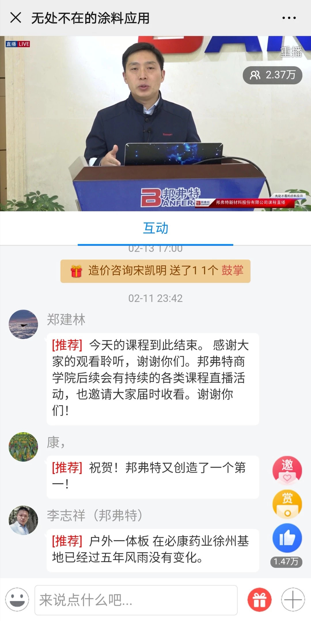 2月11日20:00,由邦弗特商學(xué)院籌劃的首場(chǎng)網(wǎng)絡(luò)視頻課程直播正式開啟,第一堂課《無(wú)處不在的涂料應(yīng)用》吸引了2.37萬(wàn)觀影人數(shù),成為行業(yè)內(nèi)網(wǎng)絡(luò)課程直播首秀!