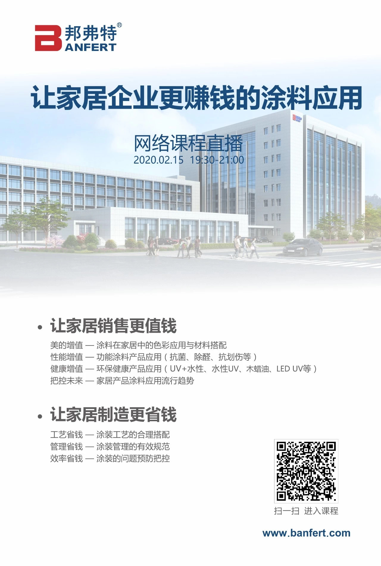 為了更加高效和便捷地和所有客戶及同行共享知識(shí),共同成長(zhǎng),邦弗特將在2月15日19:30-21:00推出第二期網(wǎng)絡(luò)視頻直播課程《讓家居企業(yè)更賺錢的涂料應(yīng)用》。