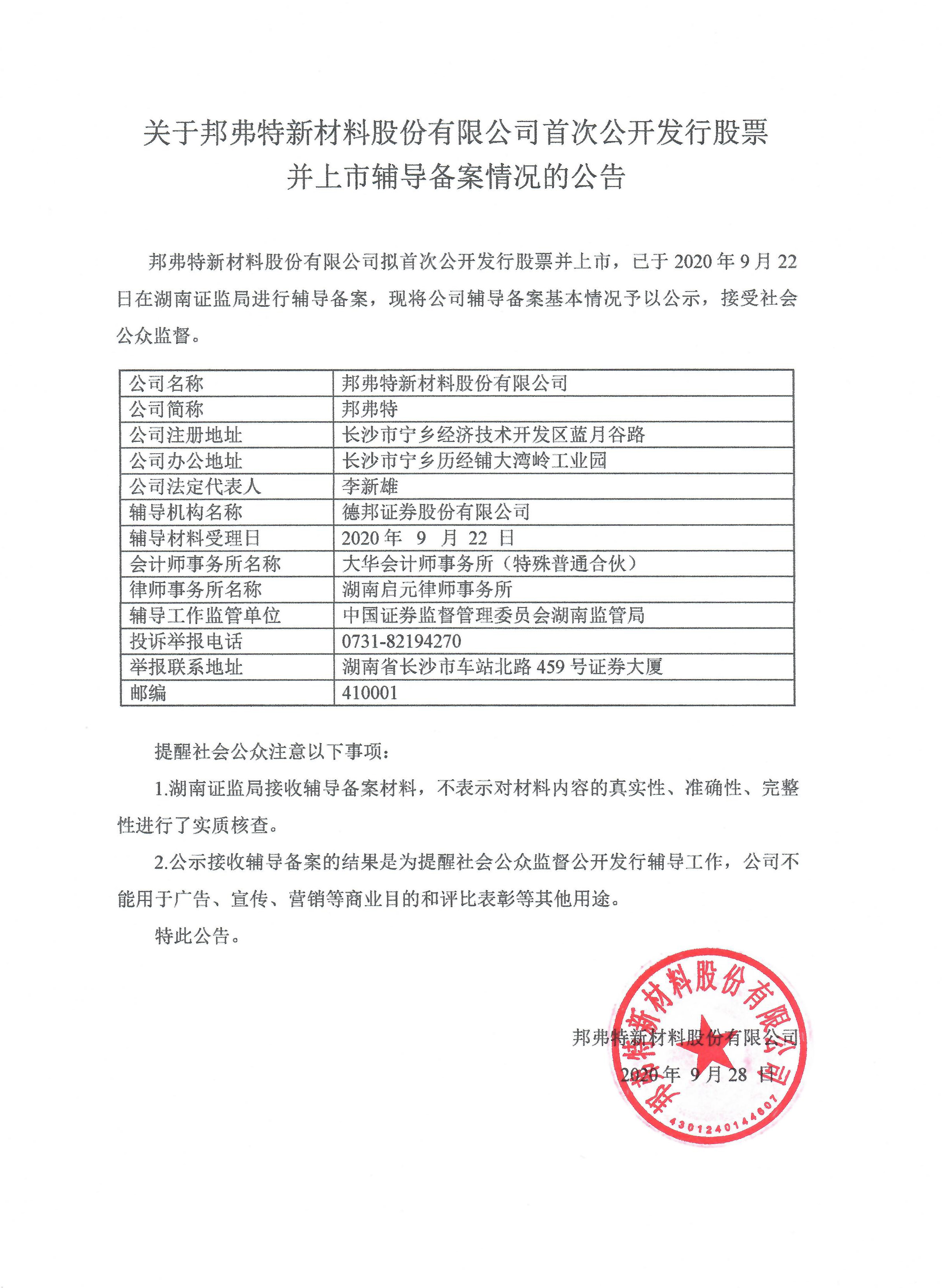 關(guān)于邦弗特新材料股份有限公司首次公開發(fā)行股票并上市輔導備案情況的公告