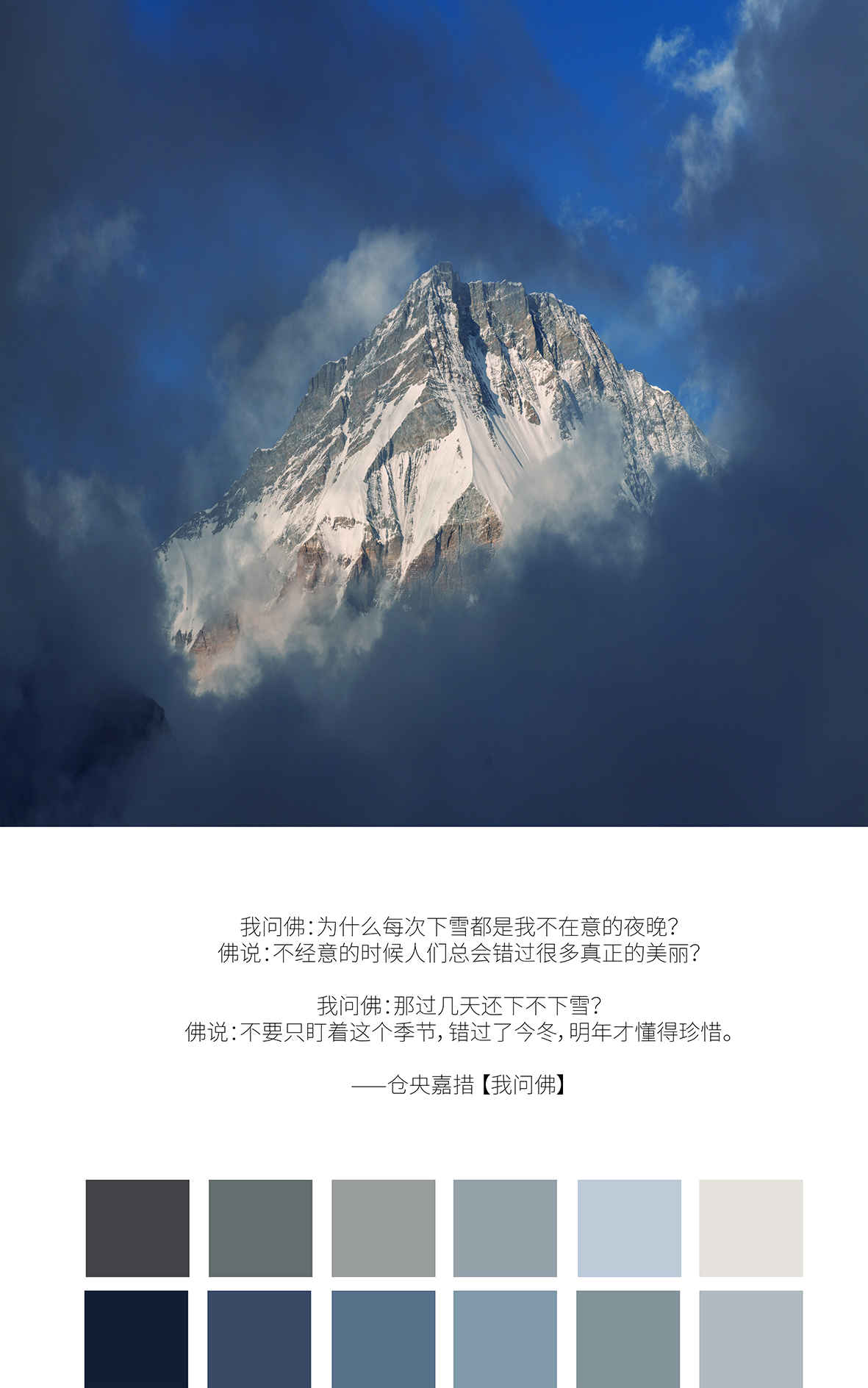 雪山不止一種顏色,茫茫雪山云煙縹緲,雪域秘境下流溢著裊裊、朦朦、顫動(dòng)的夢(mèng)幻色彩,冷調(diào)的雪晶、凝雨、煙雪青、碧穹,暖調(diào)的雪肌、雪山褐、雪蓋咖、雪霧紫在雪山中隱隱蔓延,像迷霧中前行的人生,因煥變而多姿,因探索未知世界而享受充實(shí)的欣喜。