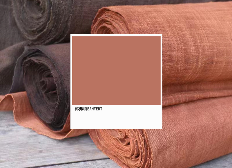 不同柿染方法能產生豐富的色,邦弗特2022年「柿染色」以橙為主色,精制從低純度到中純度,從低明度到高明度多個色號,賦予豐富層次感與精微紋理感,積淀幾千年的祝福,以滿足家居領域中不同品類產品藝術性、創意性、幸福感需求。