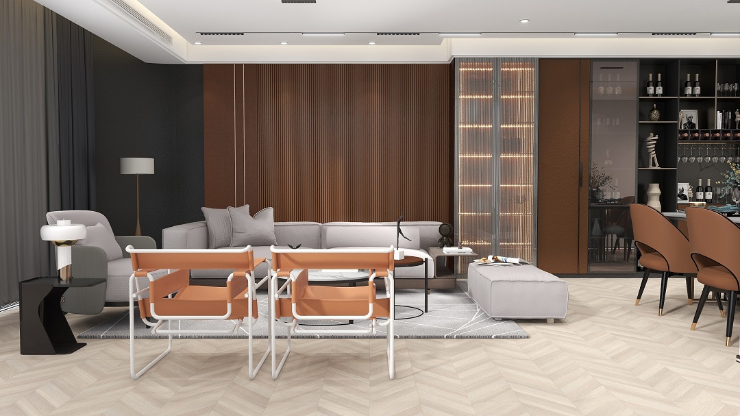 充滿陽光感的“柿染橙”色系,以大面積低純度色彩調和空間,小面積中強彩度對比、強明度對比以及低色溫差,非常好地詮釋了Z世代有節制的優雅干練。