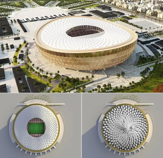 中國(guó)鐵建國(guó)際集團(tuán)承建的盧賽爾體育場(chǎng)(Lusail Stadium)是卡塔爾世界杯決賽的主體育場(chǎng)。盧賽爾體育場(chǎng)球場(chǎng)外觀以椰棗碗和琺瑯燈籠為設(shè)計(jì)靈感,頂部膜系統(tǒng)紋樣是斐波那契數(shù)列圖類型,是現(xiàn)實(shí)與夢(mèng)幻的設(shè)計(jì)建造典范。