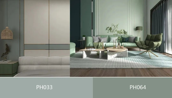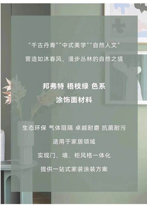 邦弗特2022·“青綠江南”色系,將典雅宋韻用之于家居空間,邦弗特2023·“梧枝綠”色系,續寫“青綠”篇章,承千古丹青,將古代傳統文化從物質形態向家居領域應用衍生與轉化。