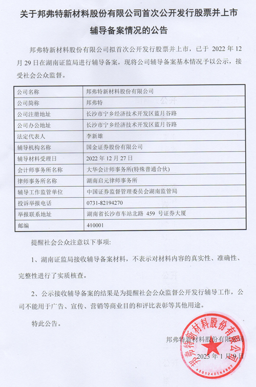 邦弗特新材料股份有限公司擬首次公開發行股票并上市,已于 2022年12月29日在湖南證監局進行輔導備案,現將公司輔導備案基本情況予以公示,接受社會公眾監督。