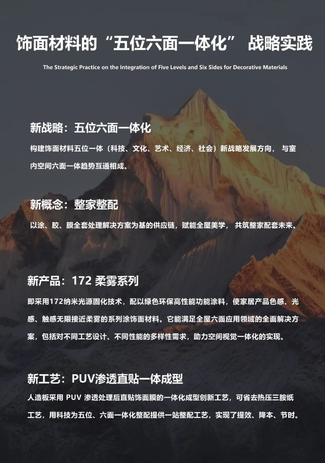 作為“五位六面一體”的產(chǎn)品技術(shù)支撐,新產(chǎn)品新工藝亮點(diǎn)多多。其中,172柔霧系列產(chǎn)品帶著柔霧細(xì)膩的觸感、河圖洛書(shū)的紋理、均勻的光感,精工細(xì)作,極具沖擊力地展現(xiàn)在人們眼前。免三胺紙、無(wú)醛環(huán)保、粘接力強(qiáng)……人造板采用 PUV 滲透處理后直貼飾面膜的一體化成型創(chuàng)新工藝,將雙組份、UV固化滲透劑的效能突破性發(fā)揮到最大,達(dá)到降本增效的目的。