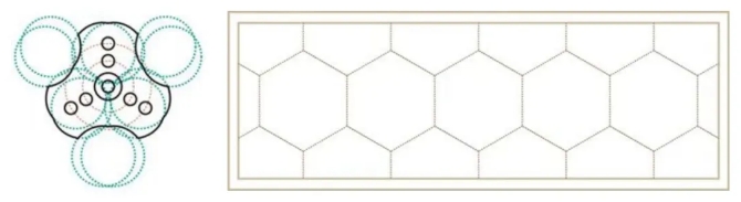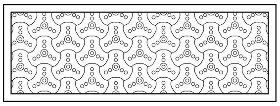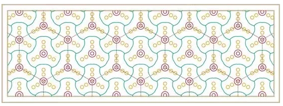 瑣子由倒“Y”型單元形組成,單元形構成框架為等邊三角形,中心由一對同心圓組成,分別向正上方、左下方和右下方每每間隔120°發散兩個圓形,外輪廓由六個雙元組合形嵌套而成,整體造型呈三重軸結構。每個單元形的任意一邊都能與另一個單元形的某一邊契合,以此相連組成瑣子紋;以一個單元形為中心連接周圍單元形的中心點,則會得到一個六邊形框架。