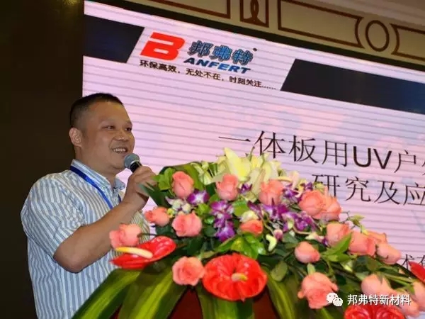 邦弗特應邀參加了此次盛會,項目總監王林在會議上作了《一體板用UV戶外涂料的研究及應用》主題報告。王總分析, 2016年中國外墻保溫市場容量約為7億平方米,其中保溫裝飾一體化板約為6千萬平方米,隨著建筑節能要求的不斷提高,一體板市場在未來的三至五年內將迎來爆發式增長,環保高效的UV涂裝解決方案已成為涂裝升級的必然趨勢。
